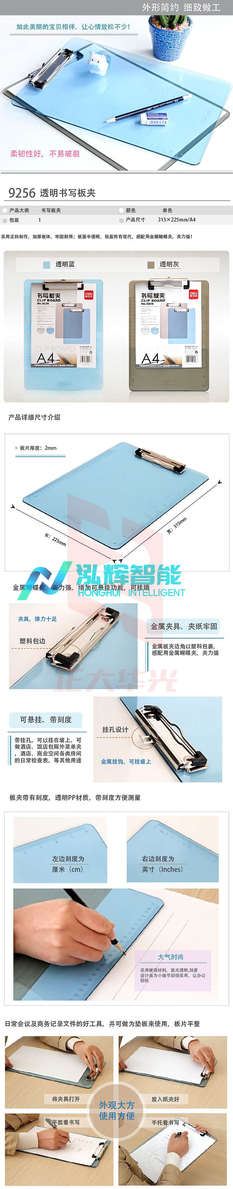 得力9256 316x230mm/A4 厚2.1mm透明书写板夹(透明蓝)(只)XTGM01090939253391