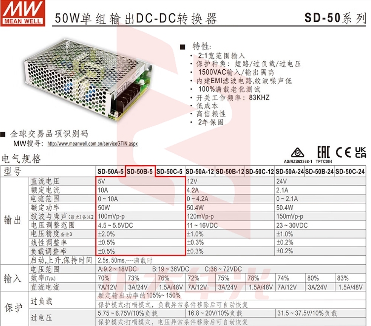 明纬(MEANWELL)SD-50B-5 DC转DC变压器电源驱动 明纬电源 10A 5v