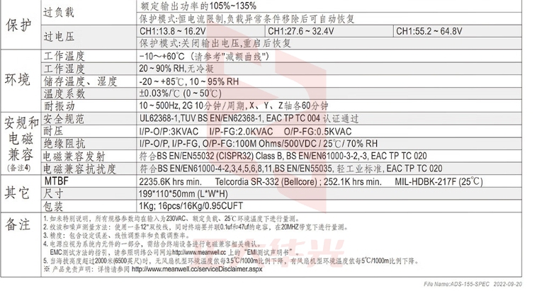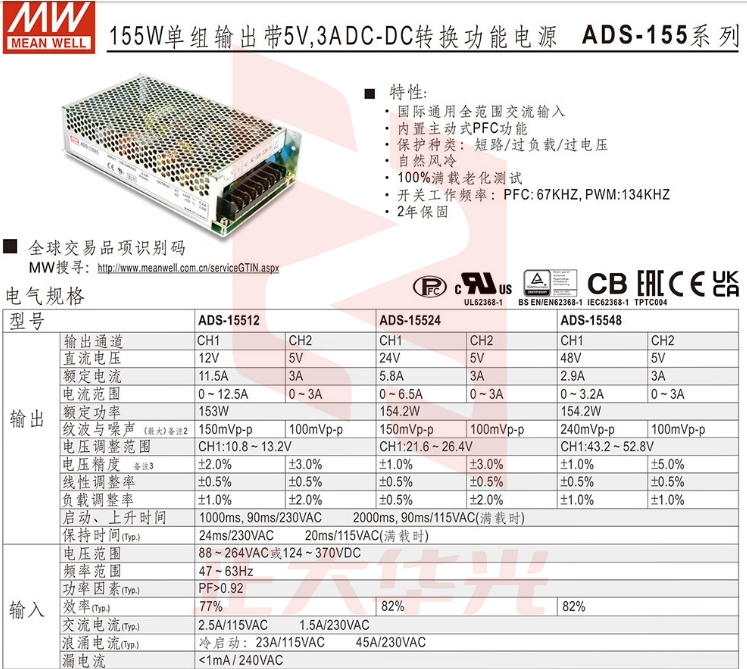 明纬(MEANWELL)双路明纬电源24V 5.8A 5V3A输出 ADS-15524