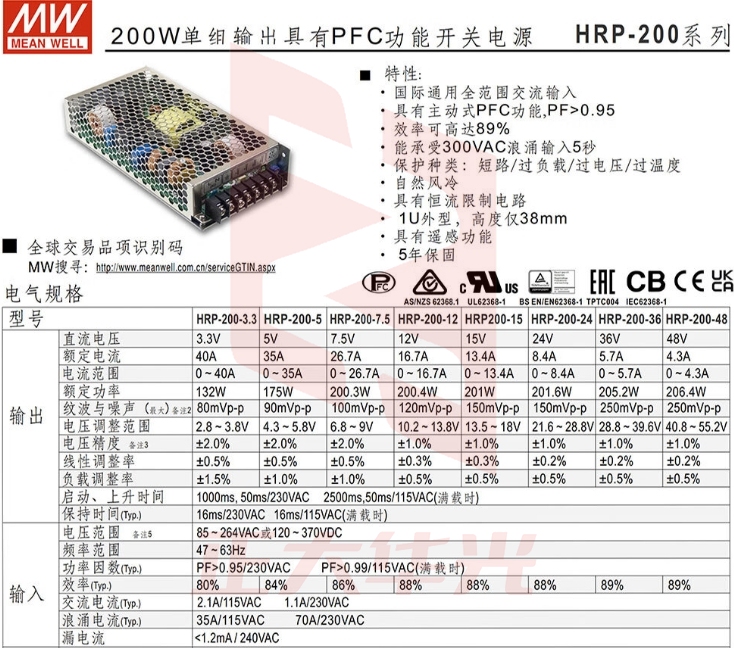 明纬(MEANWELL)开关电源12V 16.7A 高效PFC HRP-200-12