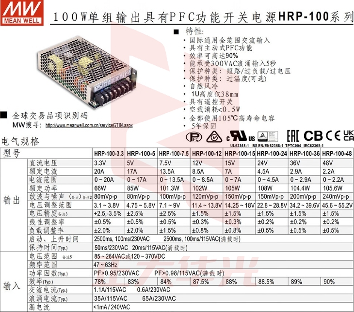 明纬(MEANWELL)明纬电源12V 8.5A PFC输出医疗精密设备驱动模块 HRP-100-12