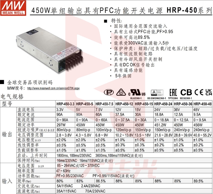 明纬(MEANWELL)开关电源7.5V 60A 带PFC功能 HRP-450-7.5
