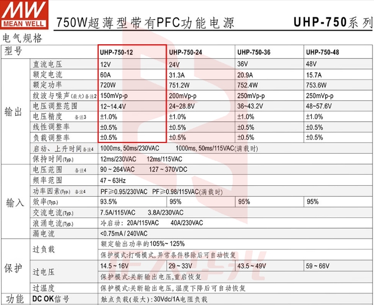 明纬(MEANWELL)明纬电源12V 60A 具有PFC高性能超薄 UHP-750-12