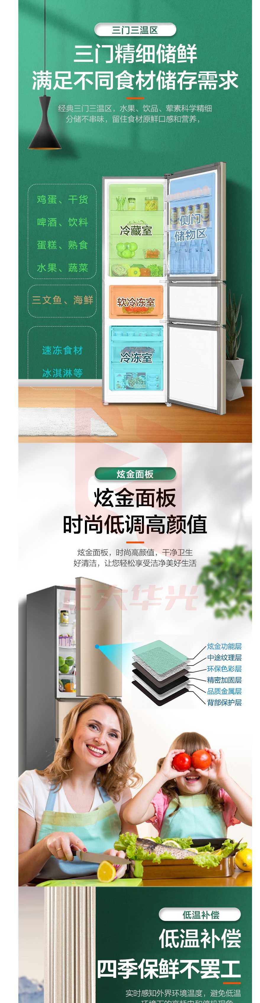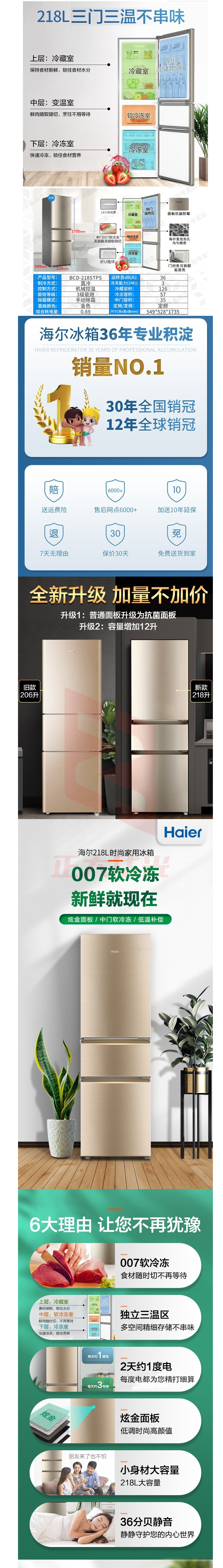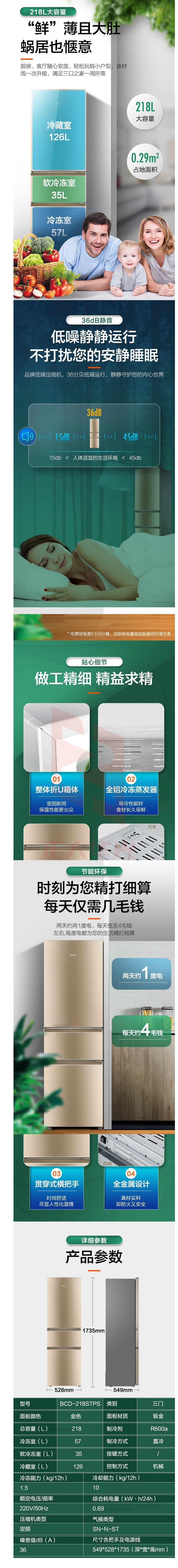 海尔BCD-218STPS冰箱大容量节能静音218升三门冰箱 冷藏冷冻小型超薄家用电冰箱