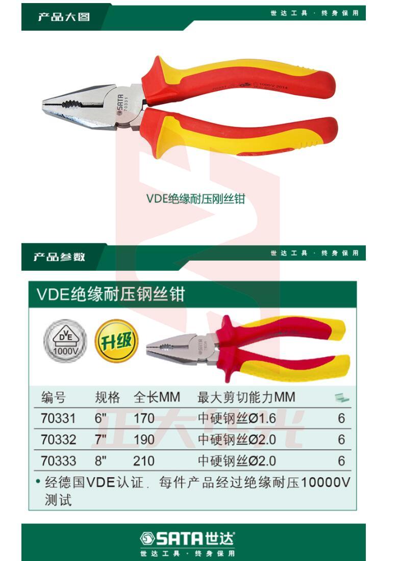 世达(SATA) VDE绝缘耐压钢丝钳 70331