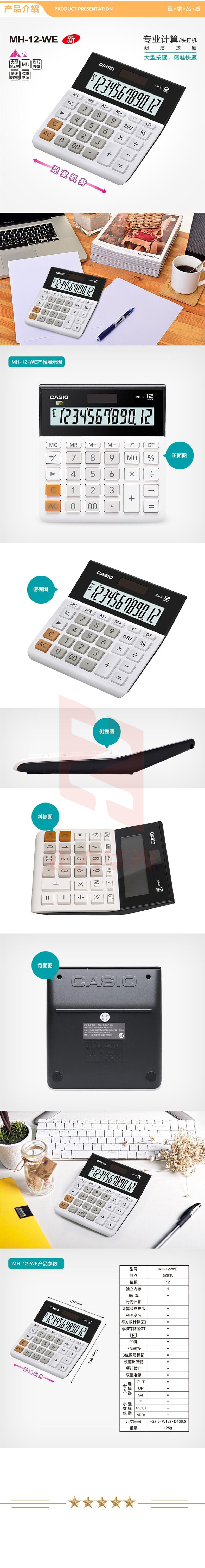卡西欧(CASIO)MH-12-WE 小型 12位 双电源 超宽计算器 白色 专业计算系列