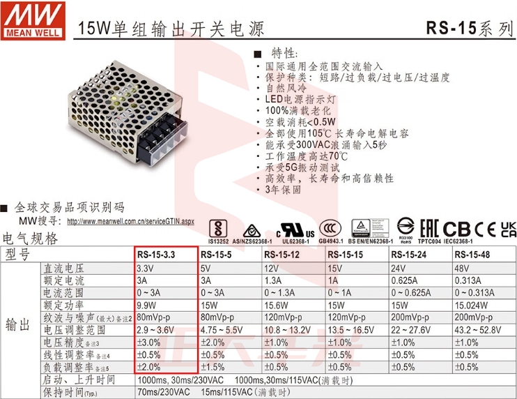 明纬(MEANWELL)RS-15-3.3 开关电源直流DC稳压变压器监控 3.3V3A