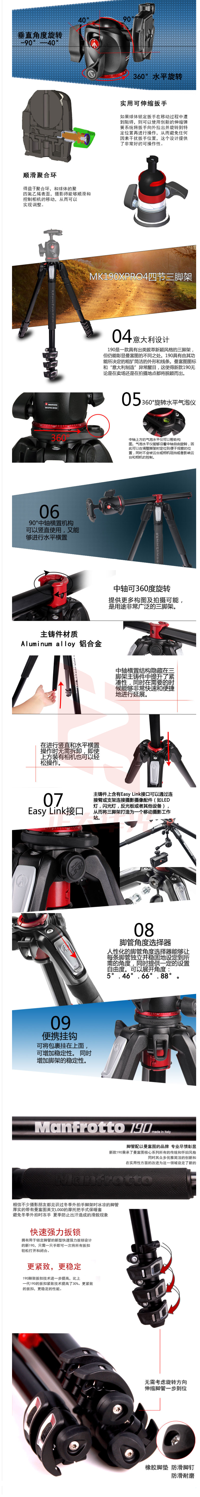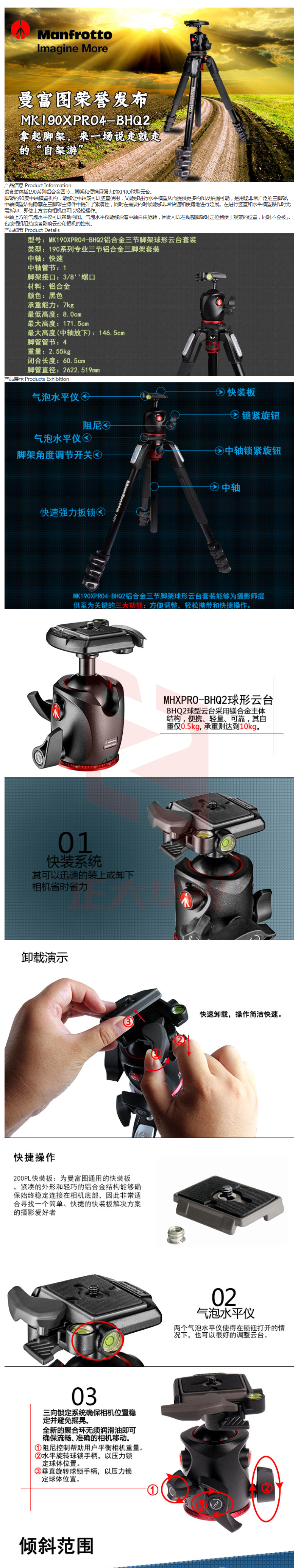 曼富图(Manfrotto)MK190XPRO4-BHQ2 单反相机铝合金4节三脚架+球形云台