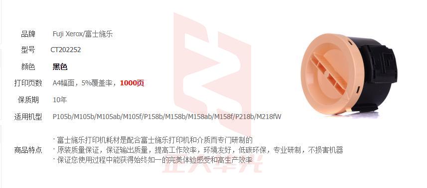 富士施乐(FujiXerox) CT202252 小容量 打印机黑色粉盒 适用于M105系列