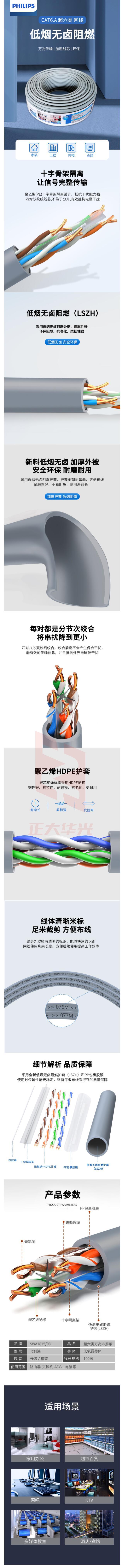 飞利浦 (PHILIPS)超六类网线CAT6A万兆非屏蔽无氧铜工程家装低烟无卤网络线灰色100米 SWA1815/93-LSZH