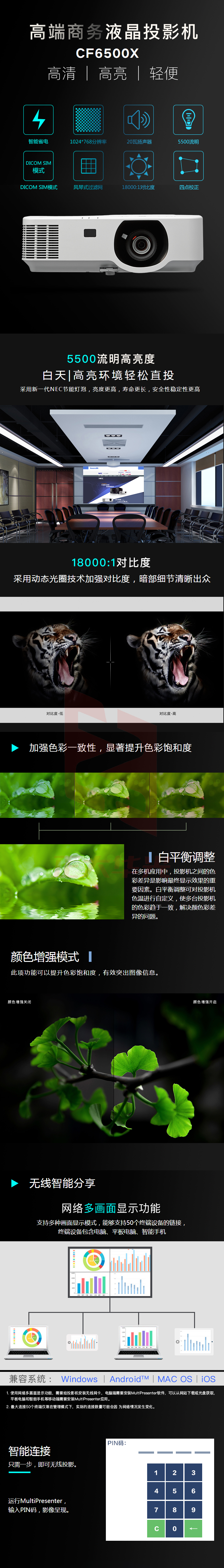 NEC 投影机 NP-CF6500X 白色 3LCD 亮度 5500流明 对比度18000:1 分辨率1024*768