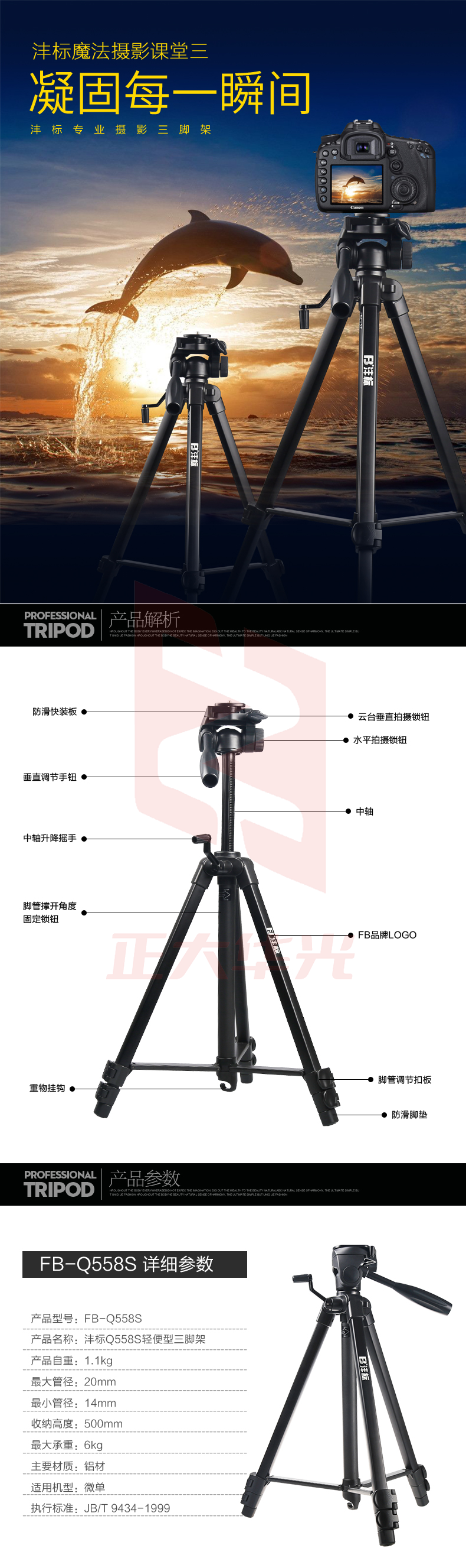 沣标(FB)便携型单反微单铝合金三脚架 FB-Q558S (承重6KG,自重1.1KG) 黑色 ZX.410