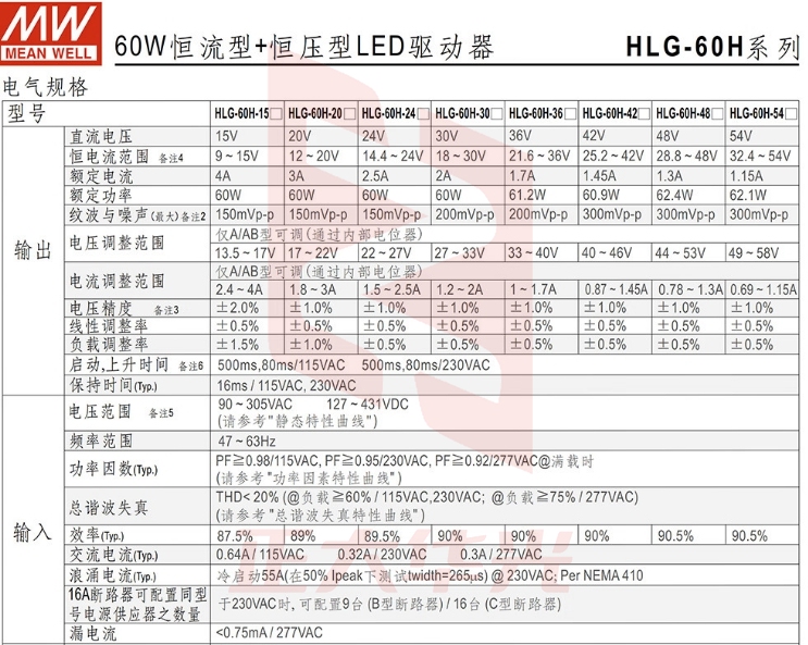 明纬(MEANWELL)HLG-60H-42内置主动式PFC恒流和恒压输出IP65防水 LED电源25.2~42V1.45A输出