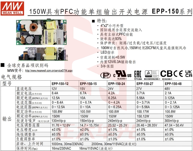 明纬 (MEANWELL)EPP-150-15带PFC功能裸板电源15V10A(不含电源线)