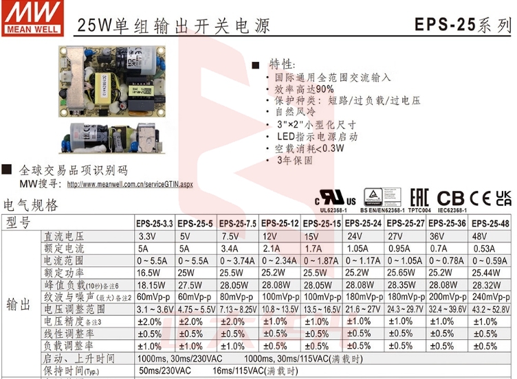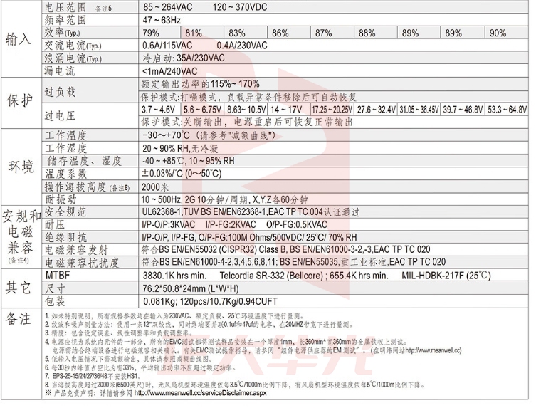 明纬(MEANWELL)明纬电源15V 1.7A 裸板小体积医疗工业电源模块 EPS-25-15