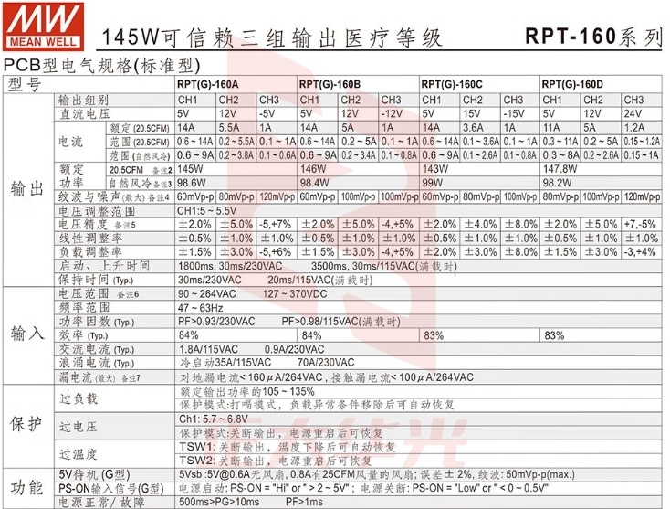 明纬(MEANWELL)RPT-160A三组输出PCB裸板开关电源5V14A/12V5.5A/-5V1A输出(不含电源线)