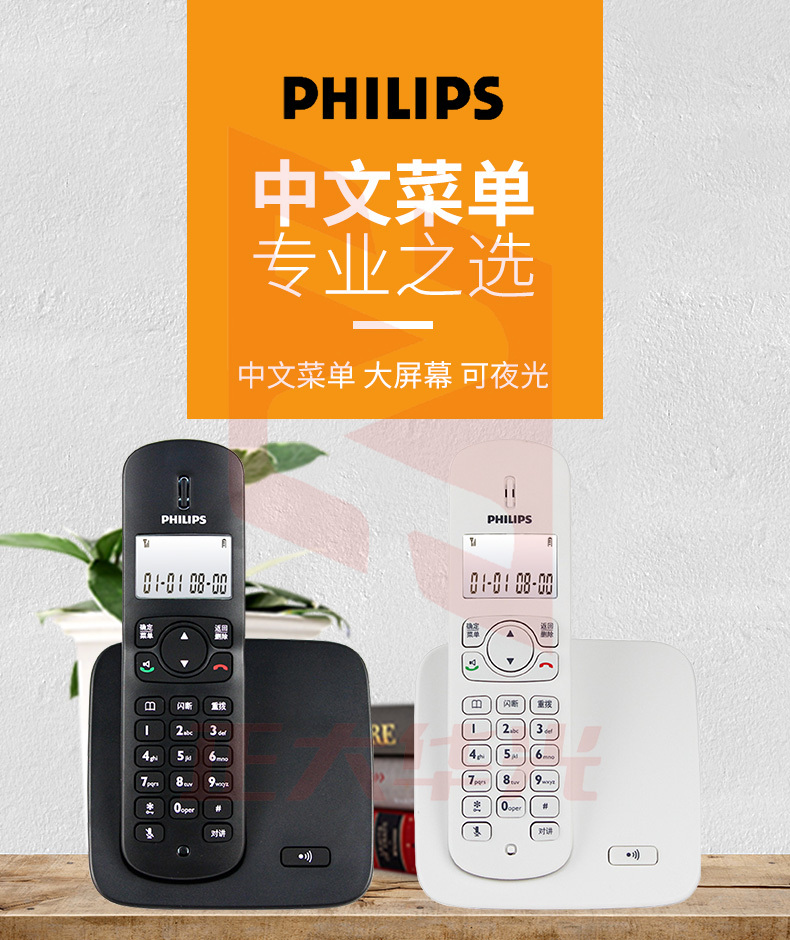 飞利浦(PHILIPS)无绳电话机 无线座机 子母机 办公家用 屏幕白色背光 持久待机 DCTG186(1+1)白色