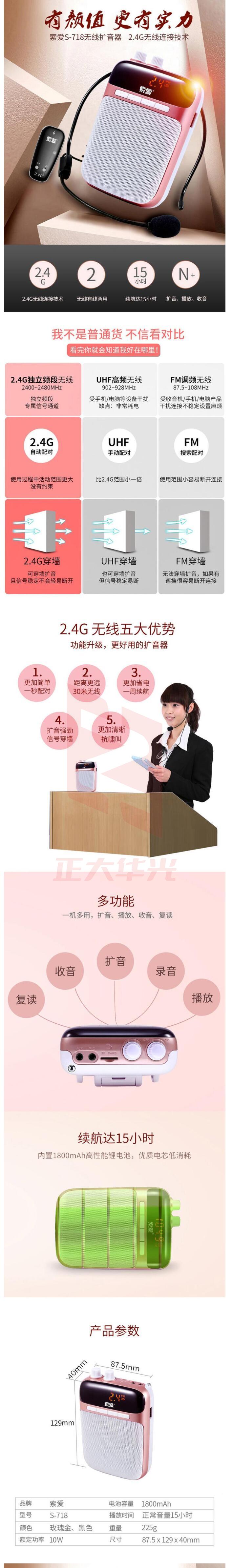 索爱(soaiy)S-718 2.4G 无线便携扩音器 大功率小蜜蜂扩音器 教师教学专用扩音机 黑色