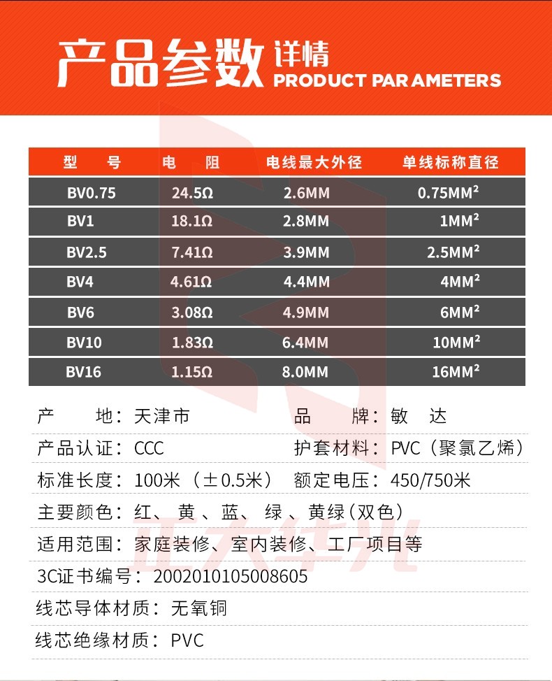 敏达电线电缆ZC-BV1.5平方 铜芯阻燃电线单芯硬线 黑色100米/盘