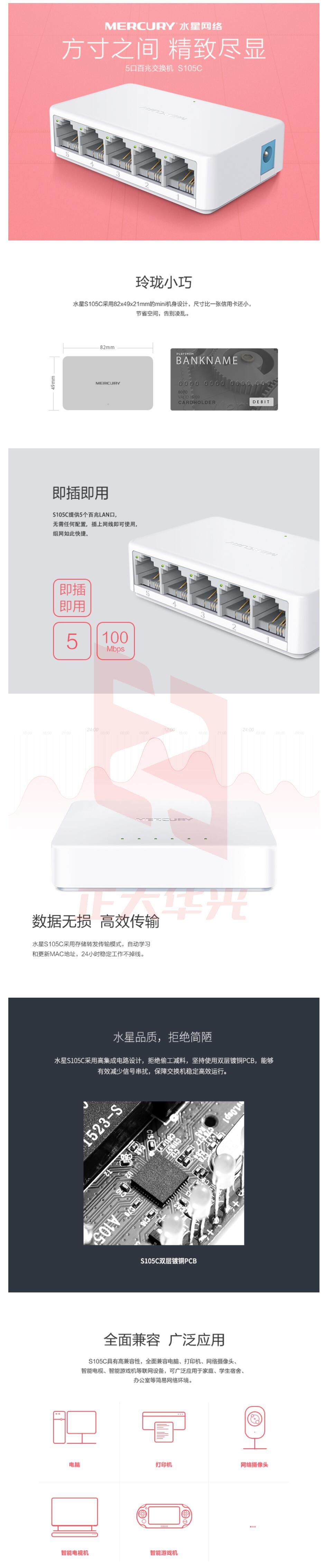 水星(MERCURY) S105C 5口百兆交换机 超小尺寸 塑壳桌面