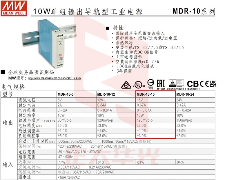 明纬(MEANWELL)MDR-10-15 AC转DC导轨电源模块 开关电源 0.67A 15v