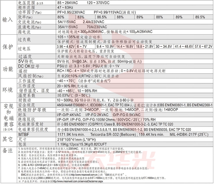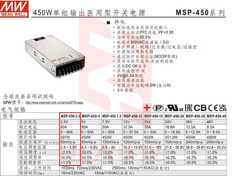 明纬(MEANWELL)MSP-450-3.3医疗开关电源低漏电流高性能直流稳压带PFC 3.3V90A输出