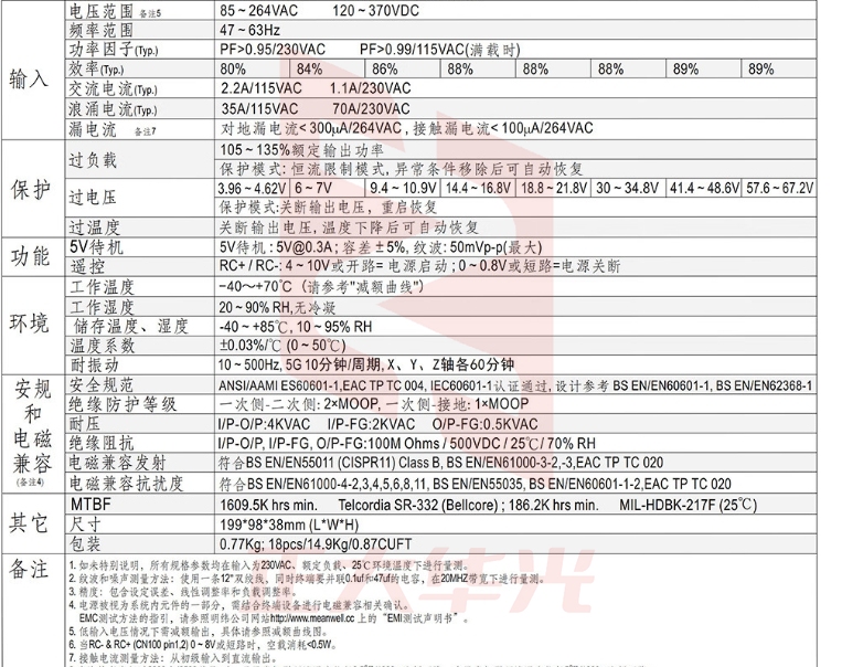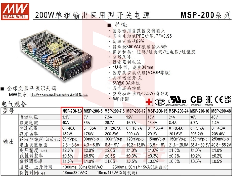 明纬(MEANWELL)MSP-200-3.3医疗开关电源低漏电流高性能直流稳压带PFC 3.3V40A输出