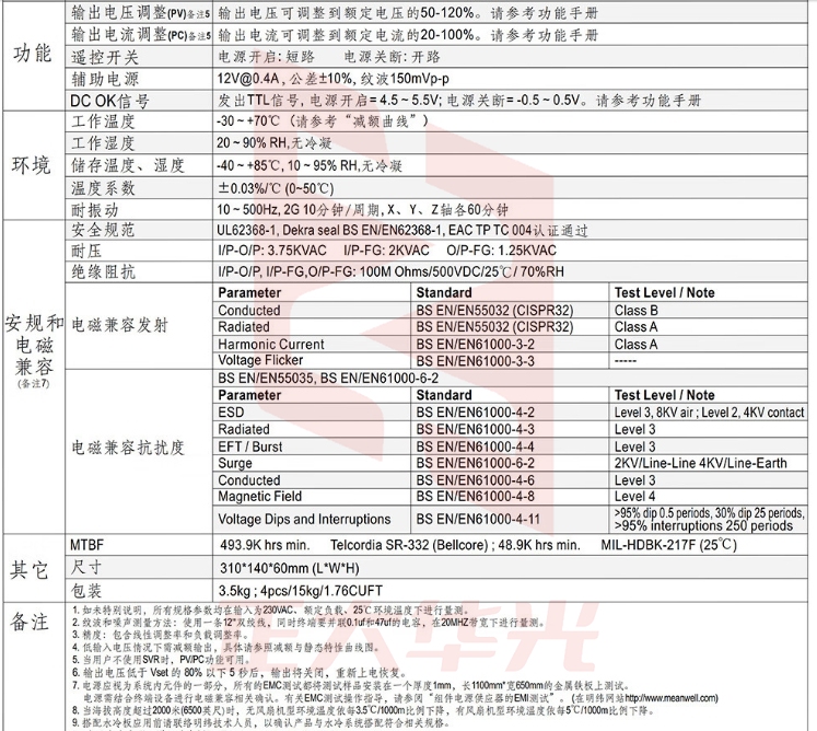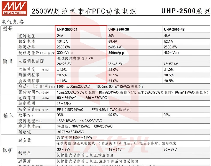明纬(MEANWELL)明纬电源36V 69.4A 具有PFC高性能超薄 UHP-2500-36