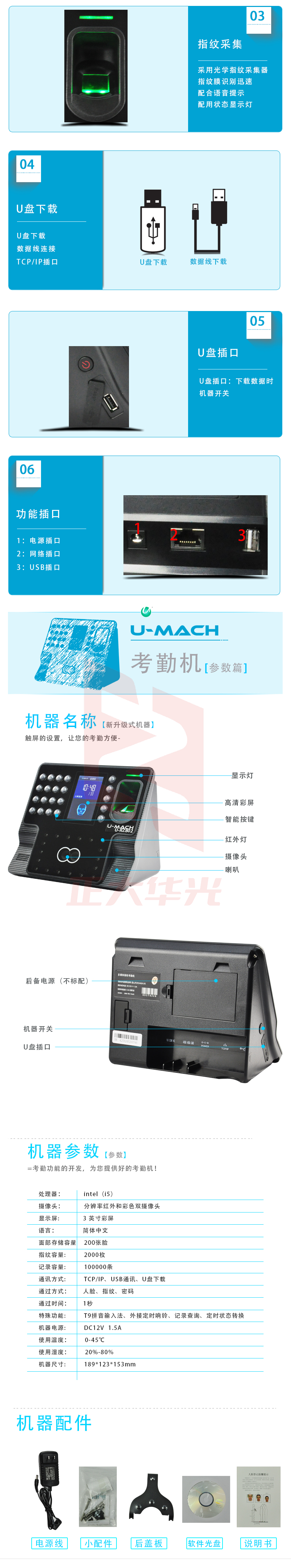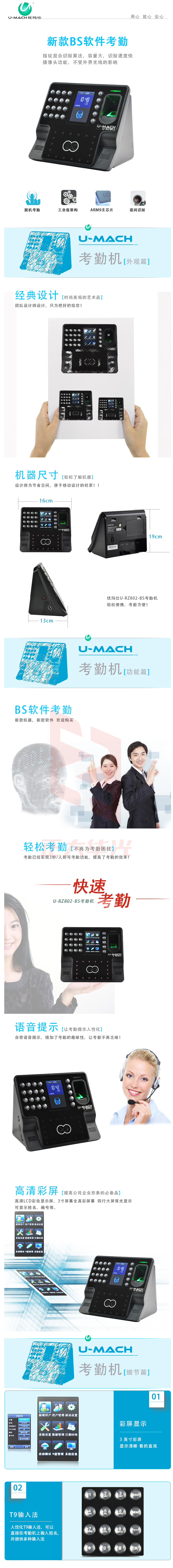 优玛仕 U-RZ802(BS)高速U盘人脸指纹异地考勤机 黑色