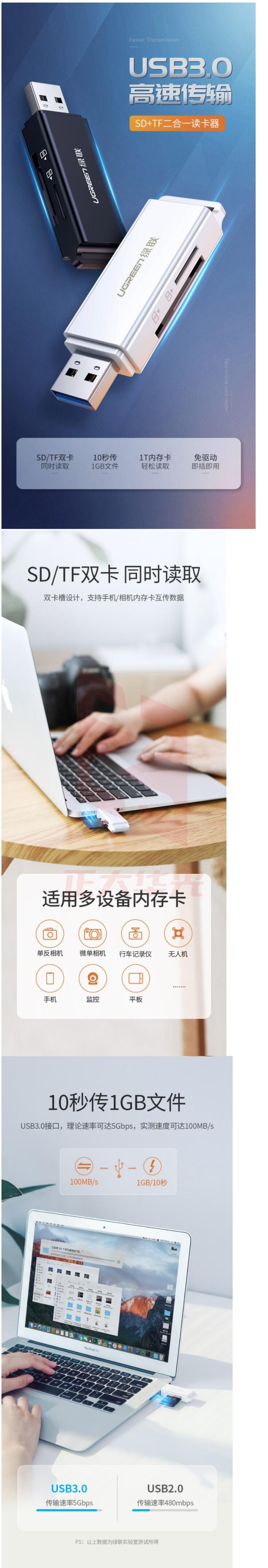 绿联(UGREEN) USB3.0多功能读卡器 支持TF/SD手机相机内存卡二合一读卡器 15CM(双卡单读)20250(5个起售)