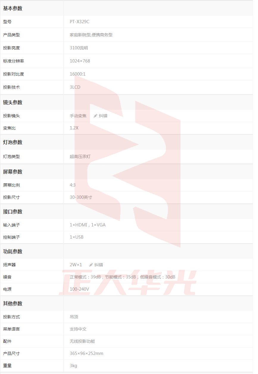 松下(Panasonic)PT-X329C 3LCD商务投影仪 3100流明/1024*768分辨率/16000:1对比度