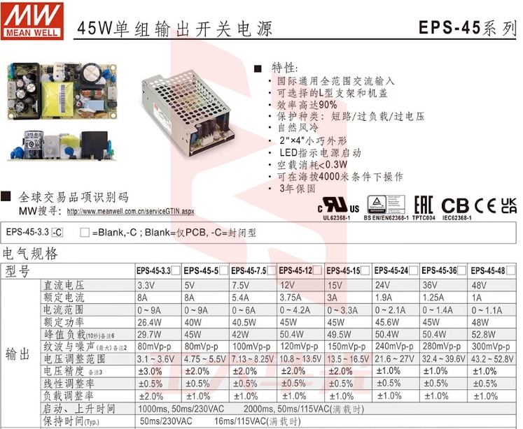 明纬(MEANWELL)明纬电源12V 3.75A PCB裸板开关电源 EPS-45-12