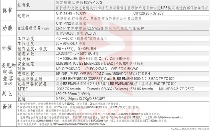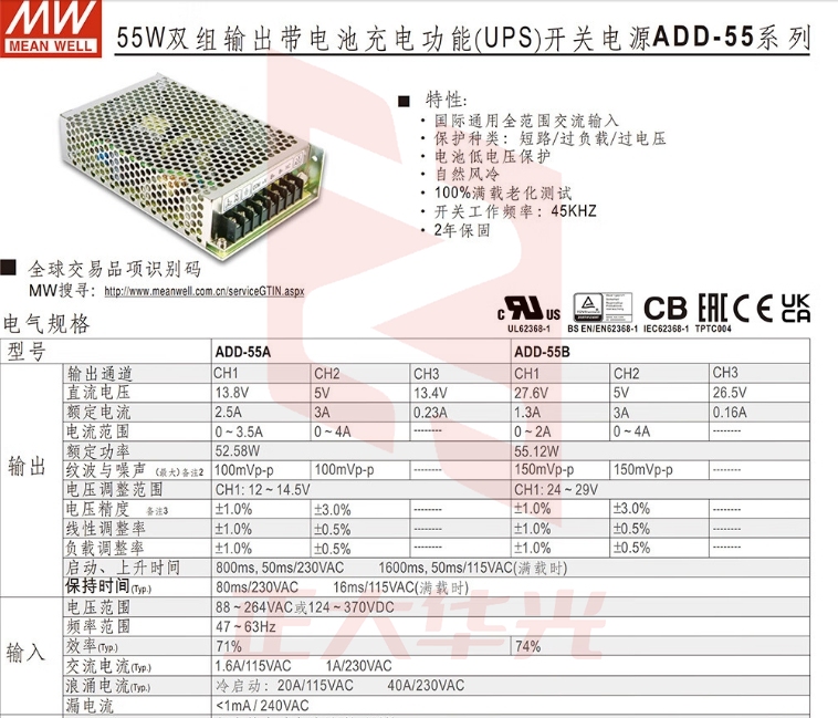 明纬(MEANWELL)ADD-55A 三路输出浮充电USP电源 明纬电源13.8V2.5A+5V3A+13.4V0.23A