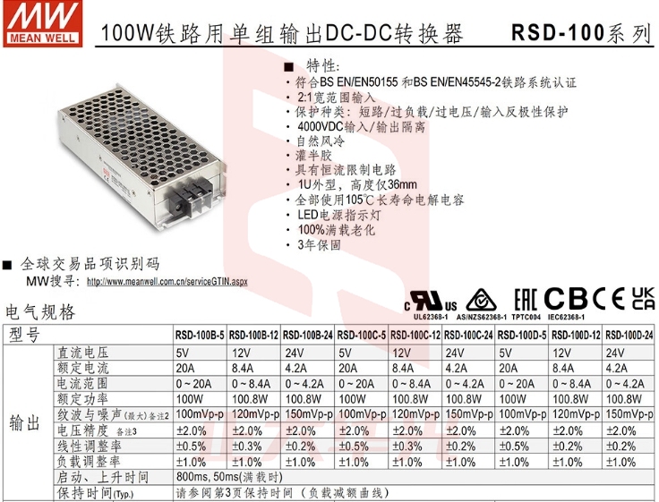 明纬(MEANWELL)RSD-100B-24 高性能恒流铁路电源 开关电源24V4.2A