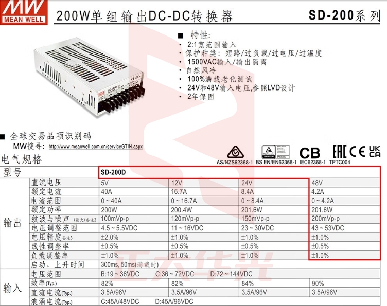 明纬(MEANWELL)SD-200B-48 DC转DC变压器电源驱动 明纬电源 4.2A 48V