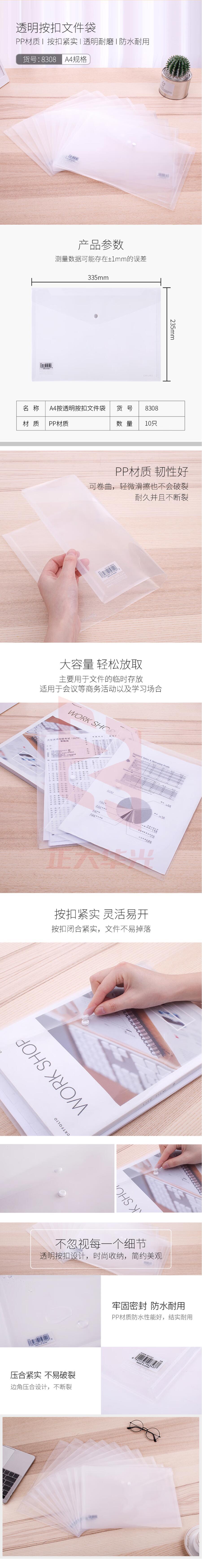得力8308 A4透明按扣文件袋 资料收纳袋