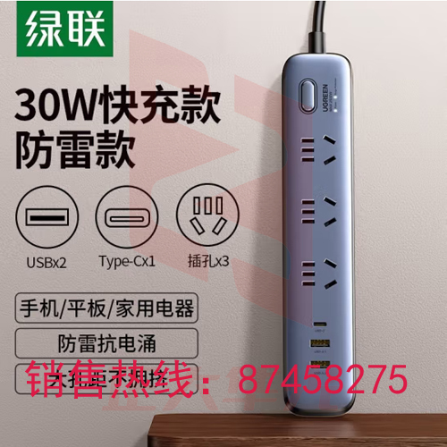 绿联(UGREEN) 新国标总控 分控插座五孔两孔 防雷排插PD快充插线板 电源转换插头 3位五孔总控 1.8米(90862) XTGM202307171030119