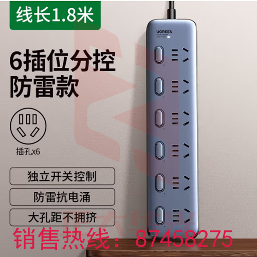 绿联(UGREEN) 插排插座排插线板面板多孔多插位功能usb拖接线板大功率防雷 90861 6位分控【黑】(XTGM2023071710301713)