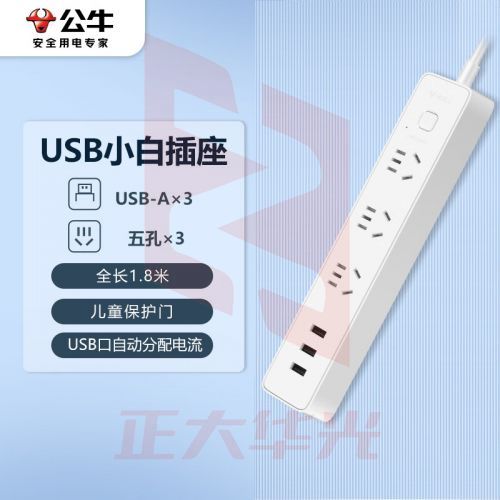 公牛(BULL)新国标公牛小白USB插座 插线板/插排/排插/拖线板 GN-B403U 3usb接口+3孔全长1.8米带保护门 XTGM202307201341205