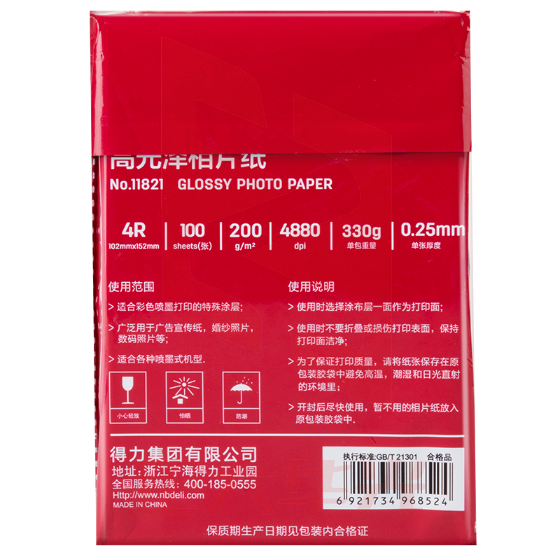 得力11821高光相片纸6寸-200g/㎡(白)(100张/盒)XTGM04111242375316