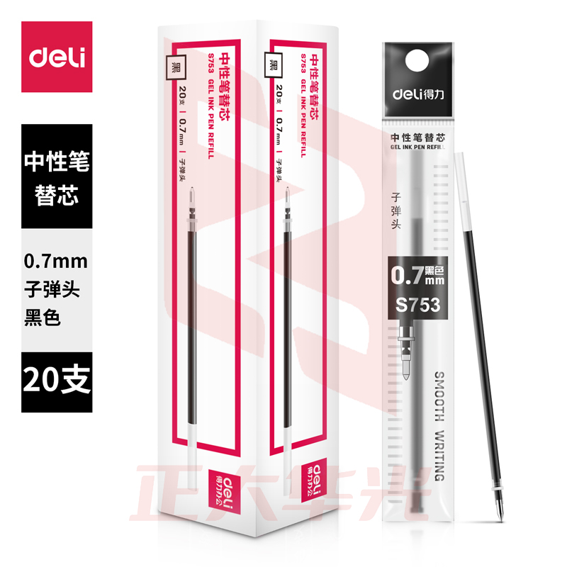 得力S753子弹头中性笔芯0.7mm子弹头(黑)(20支/盒)XTGM04171012391535