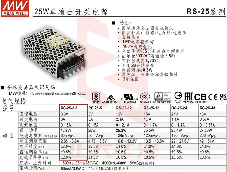 明纬(MEANWELL)开关电源 RS-25-15 直流DC稳压变压器LED电源 15V1.7A